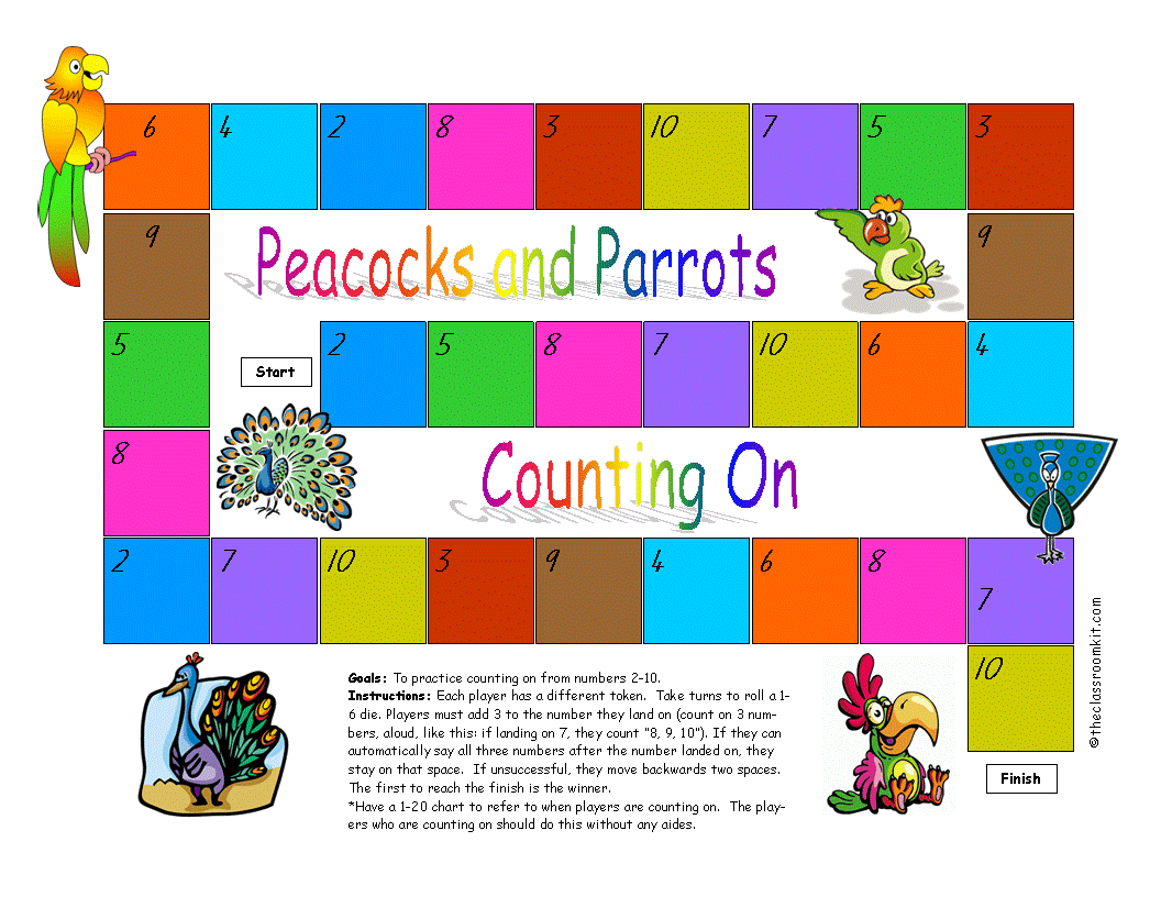 Take turns to roll two dice and state the total rolled. Each time you roll a friend of 10 pair, place a counter on one of the jungle animal. The first player to find 5 animals is the winner.
